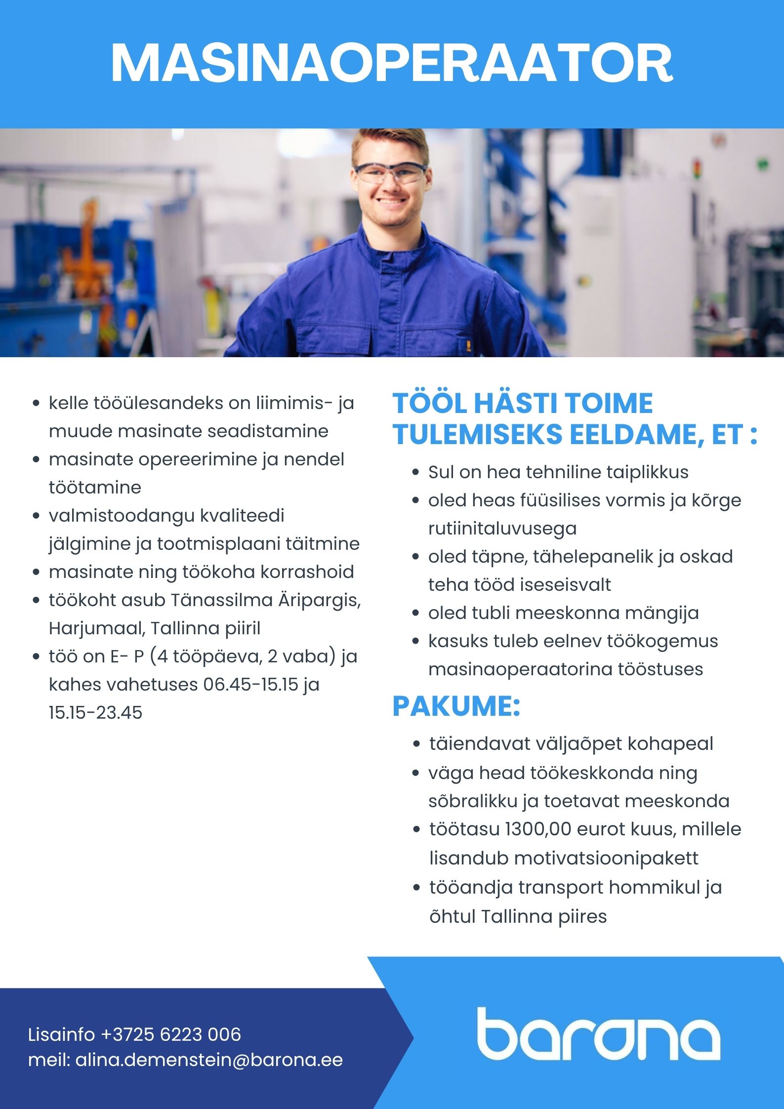 Me oleme tulevikku suunatud teerajajad, eksperdid ja probleemide lahendajad. Loome ja arendame tuleviku personalilahendusi, mis aitavad inimeste karjääril areneda ja ettevõtetel kasvada. Oleme osa rahvusvahelisest kontsernist Bravedo Oy. Lisaks Eestile ja Soomele, kus asub meie peakontor, tegutseme 10 välisriigis. Lahendame väljakutseid, leida õige, just Teile sobiv töötaja ja kasutame protsessides innovatiivseid ja loomingulisi meetodeid. Oma klientidele pakume innovatiivseid visioone ja julgelt tulevikku suunatud partnerlust. Barona töötajatele pakume põnevaid võimalusi kõikidel tööelu etappidel arendada oma oskusi ja teha karjääri.