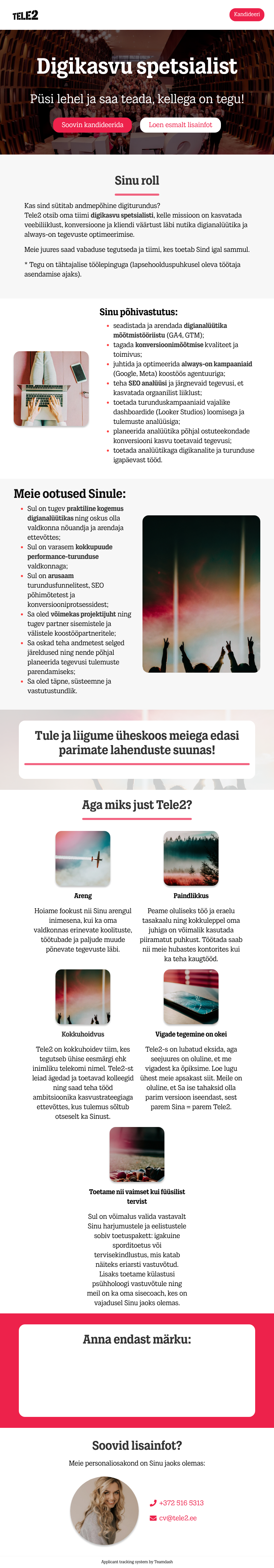 Tele2 ei ole lihtsalt tööandja – meiega saad alustada teekonda, kus oma karjäärialased unistused tegudeks pöörata. Meie juures ootab Sind paindlik ja uuendusmeelne keskkond, kus väärtustame inimesi, mitte bürokraatiat. Oleme aktiivsed ja initsiatiivikad ning liigume üheskoos Tele2 suure eesmärgi poole: pakkuda parimat kliendikogemust Eesti telekommunikatsiooni valdkonnas.