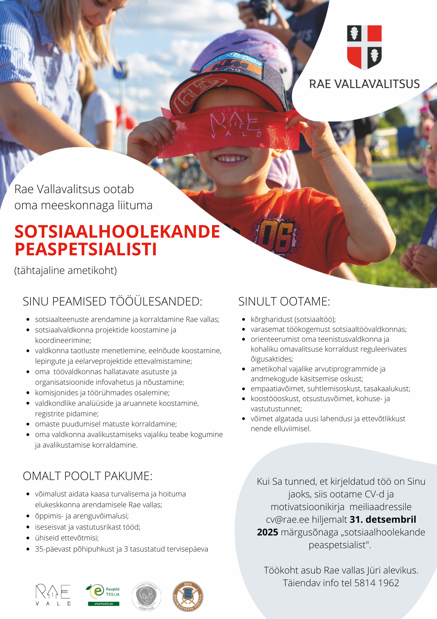 Kui Sa tunned, et kirjeldatud töö on Sinu jaoks, siis ootame CV-d ja motivatsioonikirja meiliaadressile cv@rae.ee hiljemalt 31.detsembril märgusõnaga "sotsiaalhoolekande peaspetsialist". Täiendav info tel 5814 1962