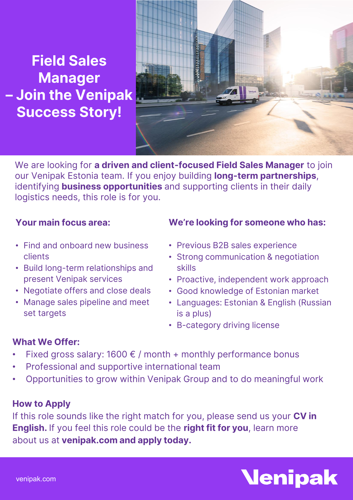 Venipak on Leedus, Lätis, Eestis ja Euroopa teistes riikides kiirkulleriteenuseid ja muid logistikalahendusi pakkuv ettevõte. Venipak osaleb aktiivselt kulleriteenuste turu arengus ning, pöörates erilist tähelepanu pikaajalistele kliendisuhetele, tagab osutatavate teenuste parima kvaliteedi. Meie teenuseid kasutavad ettevõtted, mis on kohustunud oma kaupu ja muid saadetisi kohale toimetama ühe ööpäeva jooksul.