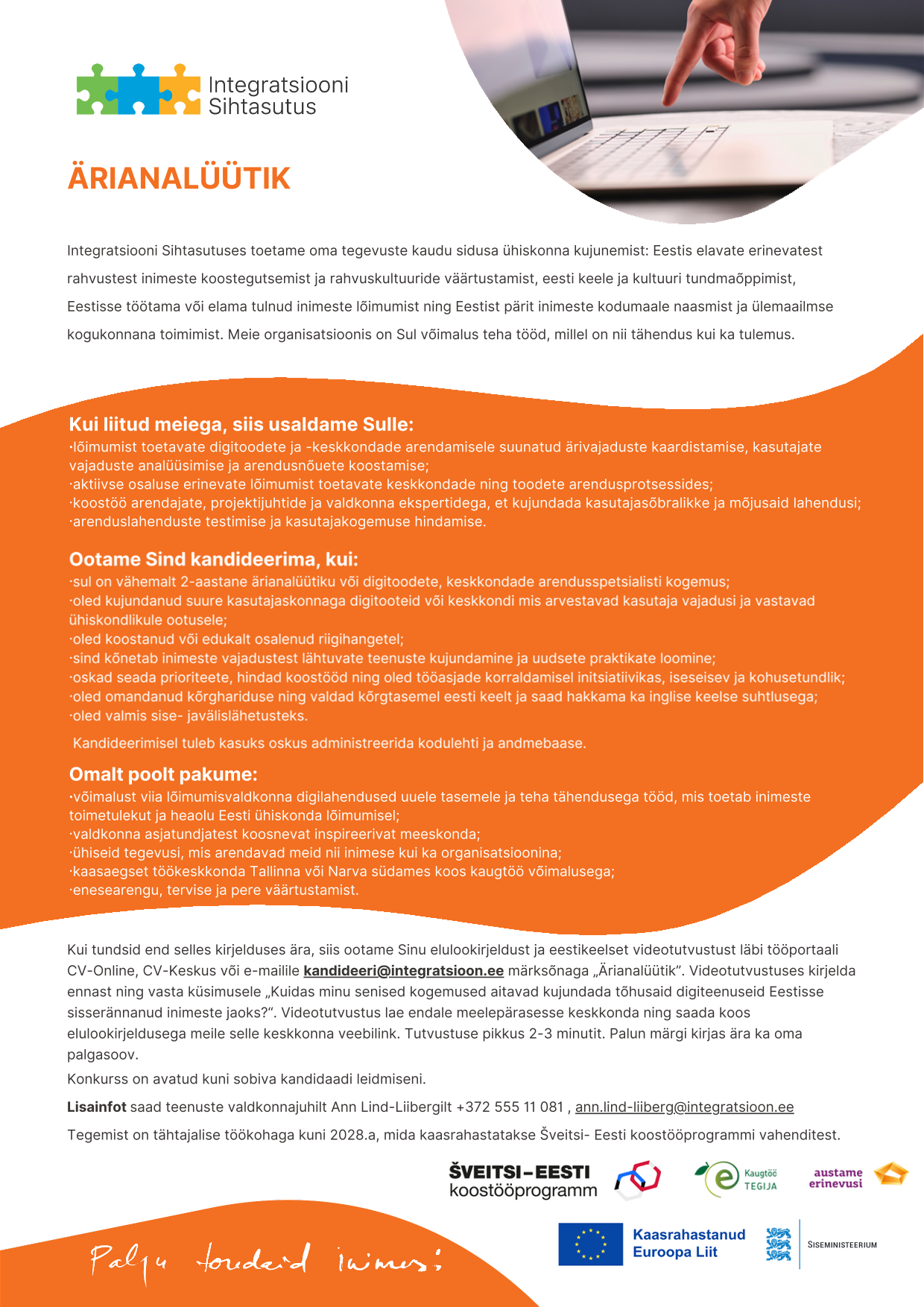 - oskad seada prioriteete, hindad koostööd ning oled tööasjade korraldamisel initsiatiivikas, iseseisev ja kohusetundlik;