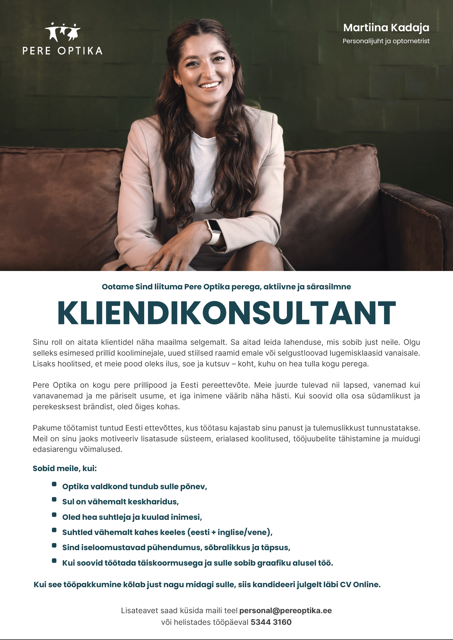 1998. aastal Keilas esimese kaupluse avanud Optiland Eesti OÜ on tänaseks Pere Optika brändi kasvatanud prillipoodide ketiks, millel on 31 kauplust üle Eesti.10.06.2024 Ühendas Optiland Eesti OÜ jõud OptiPRO OÜ-ga, kes sai ettevõtte uueks omanikuks. Kahe ettevõtte ühiste pingutustega loodame pakkuda oma klientidele veelgi kvaliteetsemat ja kättesaadavamat teenust.Pere Optika pingutab iga päev selle nimel, et meie poodidest avastaksid endale meelepärased optilised tarvikud igast vanusest ja igat hinnaklassi väärtustavad kliendid. Meie juurest leiab nii mängimis- kui õppimisprille pere kõige pisematele, trendikaid ja noortepäraseid brände teismelistele, funktsionaalseid tööprille aktiivsele inimesele; prillimaailma tipptaset stiilsust hindavale kliendile, soodsaid variante lugemisprille vajavatele seenioritele, päikeseprille igale maitsele, kontaktläätsesid ja palju muid tarvikuid.Pere Optika on pood, kuhu tulla kogu perega, sest siin kehtib lai valik soodustusi just nendele, kes on otsustanud endale valida kõige paremini ninale istuva prilli- või päikeseprillipaari just oma kõige lähedasemate inimeste ringis.Kuna me soovime, et kvaliteetne silmanägemine oleks kättesaadav igaühe jaoks, siis oleme sisse töötanud heategevusliku süsteemi, millega saad soovi korral igalt oma ostult annetada raha paljulapseliste perede laste nägemisvõimaluste parandamiseks. Üheskoos saame aidata kogu Eesti head silmanägemist paremini säilitada.Pere Optika kollektiiv käib end pidevalt arendamas optikamessidel ja koolitustel, et tuua oma klientideni viimane sõna nii prillimoes kui kõiges, mis puudutab nägemise kvaliteedi säilitamist silmade kontrollimine, kontaktläätsede määramine, prillide valmistamine, hooldus ja parandus. Meie päralt on parim tehnika ja täpseima silmaga optometristid ja tehnikud.Kohtumiseni Pere Optikas!