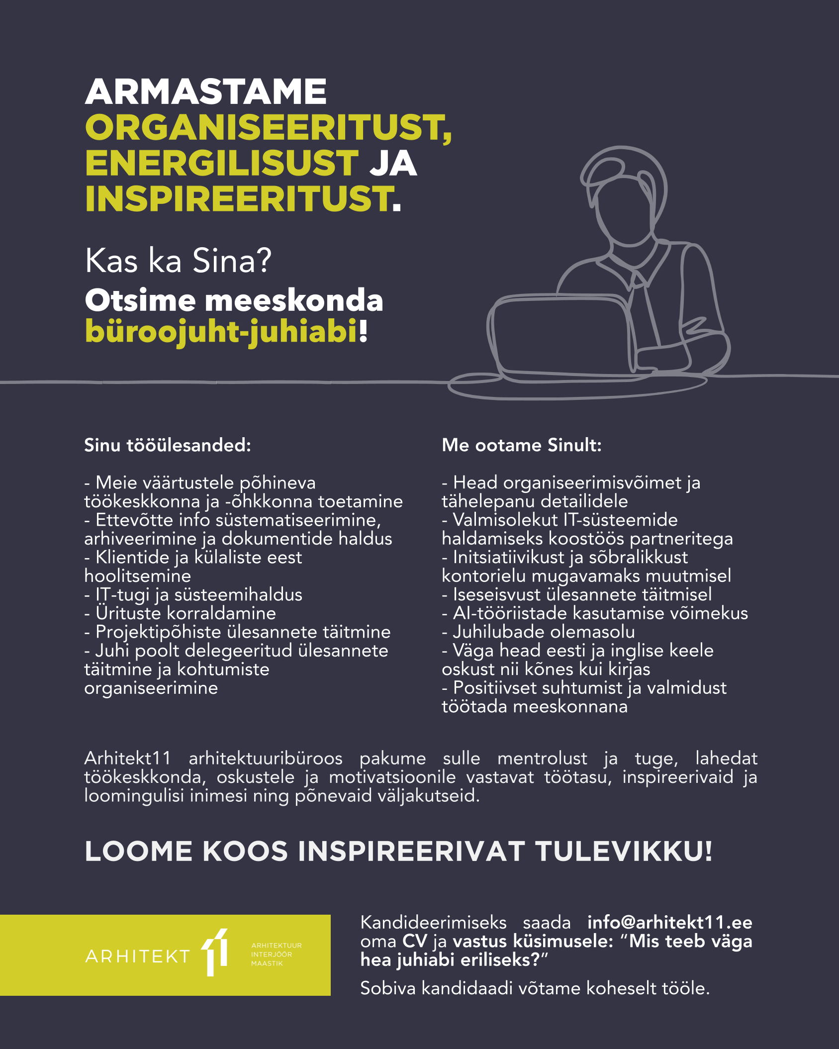 Arhitekt11 on täisteenust pakkuv arhitektuuribüroo, mis usub, et hea arhitektuur muudab inimeste elu paremaks. Loome ruume, mis ei ole lihtsalt funktsionaalsed, vaid mis räägivad lugusid ja jätavad jälje. Me kombineerime loovuse, tehnilise teostuse ja struktureeritud kaose, et luua midagi geniaalset. Meie eesmärk on alati ületada ootusi nii enda kui ka kliendi omasid. Usume, et geniaalsed ideed tulevad ise, kuid edu tuleb läbi struktureeritud tööprotsessi järgimise. Geniaalsust on siin 5% ja ülejäänud 95% on töö.