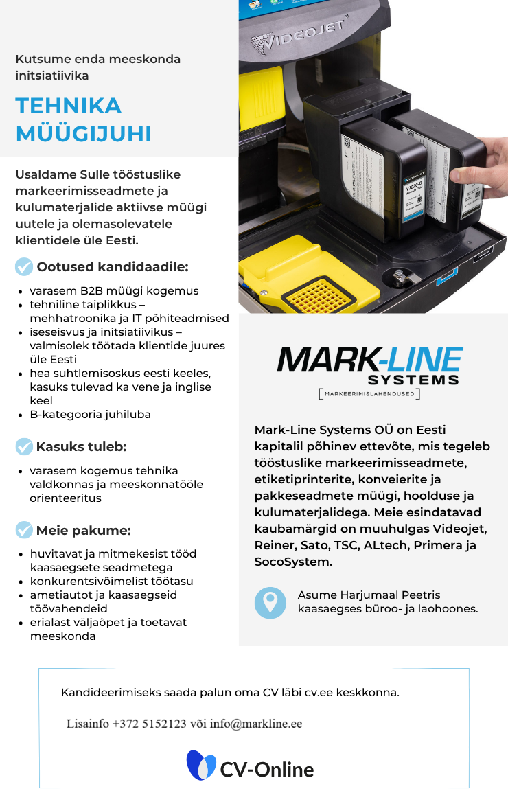 Tööstuslike markeerimisseadmete ja kulumaterjalide aktiivne müük uutele ja olemasolevatele klientidele üle Eesti.