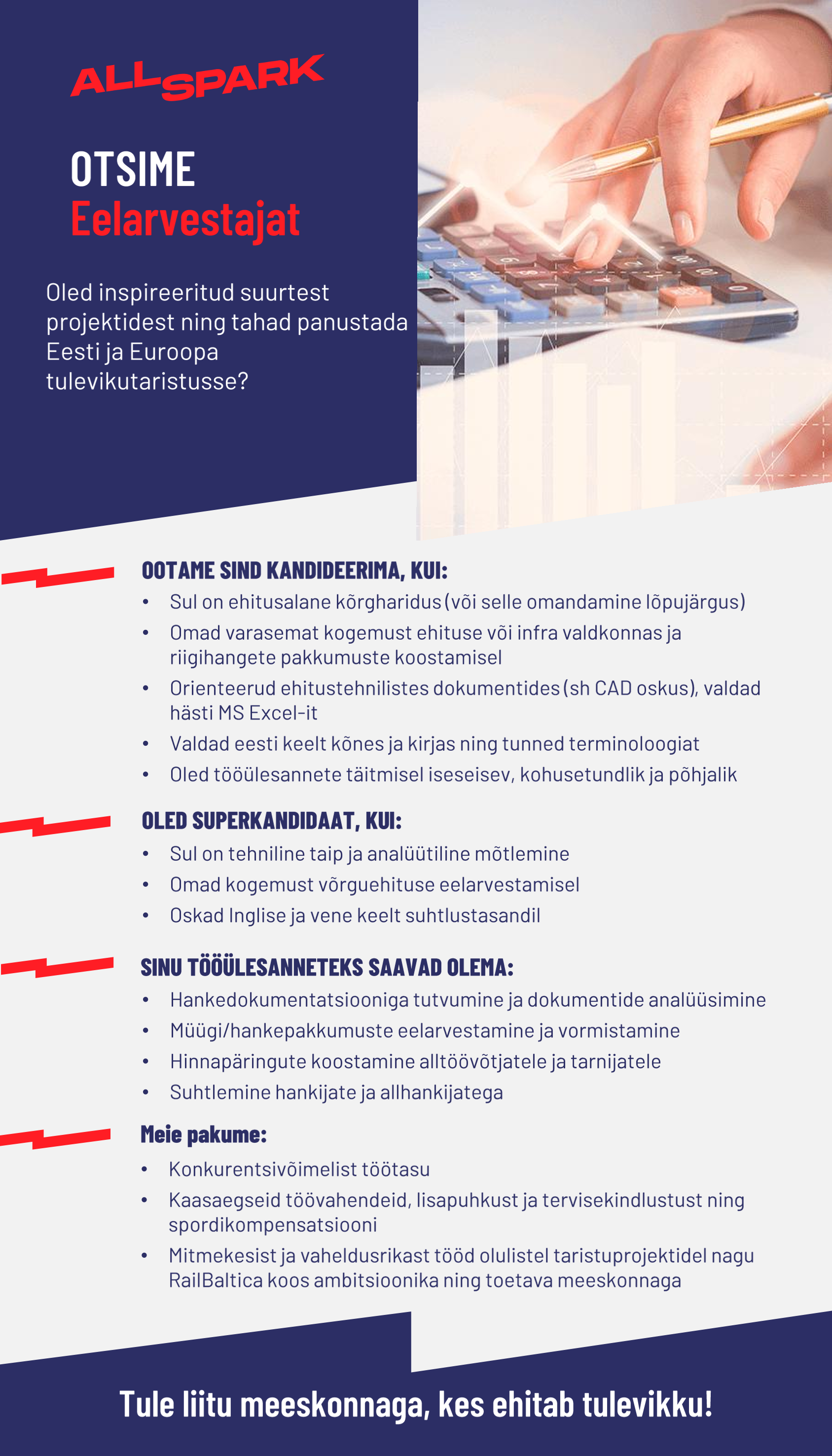 - Omad varasemat kogemust ehituse või infra valdkonnas ning riigihangete pakkumuste koostamisel