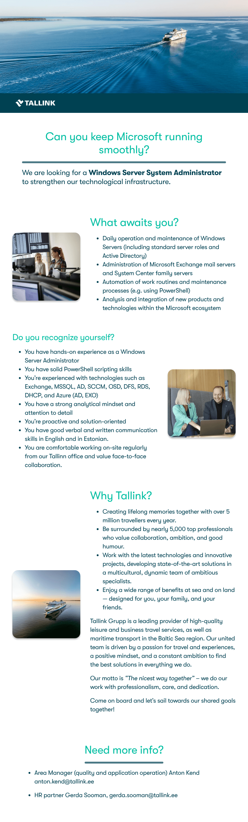 Tallink on Läänemere suurim ja edukaim reisilaevandusfirma. Tallink on Eesti hingega põhjamaine ettevõte, mis on rahvusvahelise kontsernina esindatud Eestis, Soomes, Rootsis, Lätis ja Saksamaal. Laevanduse kõrval on meil aastakümnete pikkune kogemus nii hotellinduses, jaekaubanduses, meelelahutuses, restoraniäris ja muuski. Äritegevuses seame esikohale jätkusuutlikkuse ning peame oluliseks mööndusteta kvaliteeti.