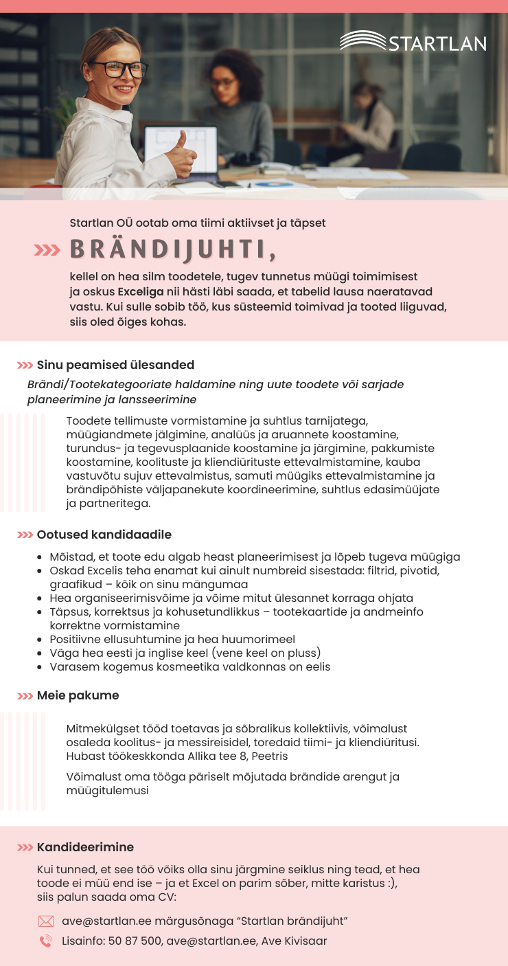 Startlan OÜ on 2003. aastal asutatud 100% Eesti kapitalil põhinev kosmeetika- ja esmatarbekaupade hulgimüügiga tegelev ettevõte. Esindatakse mitmeid nimekaid brände ja tehakse koostööd kõigi suuremate hüper- ja supermarketite, apteekide, SPA-de ja ilusalongidega. Rohkem infot loe www.startlan.ee
