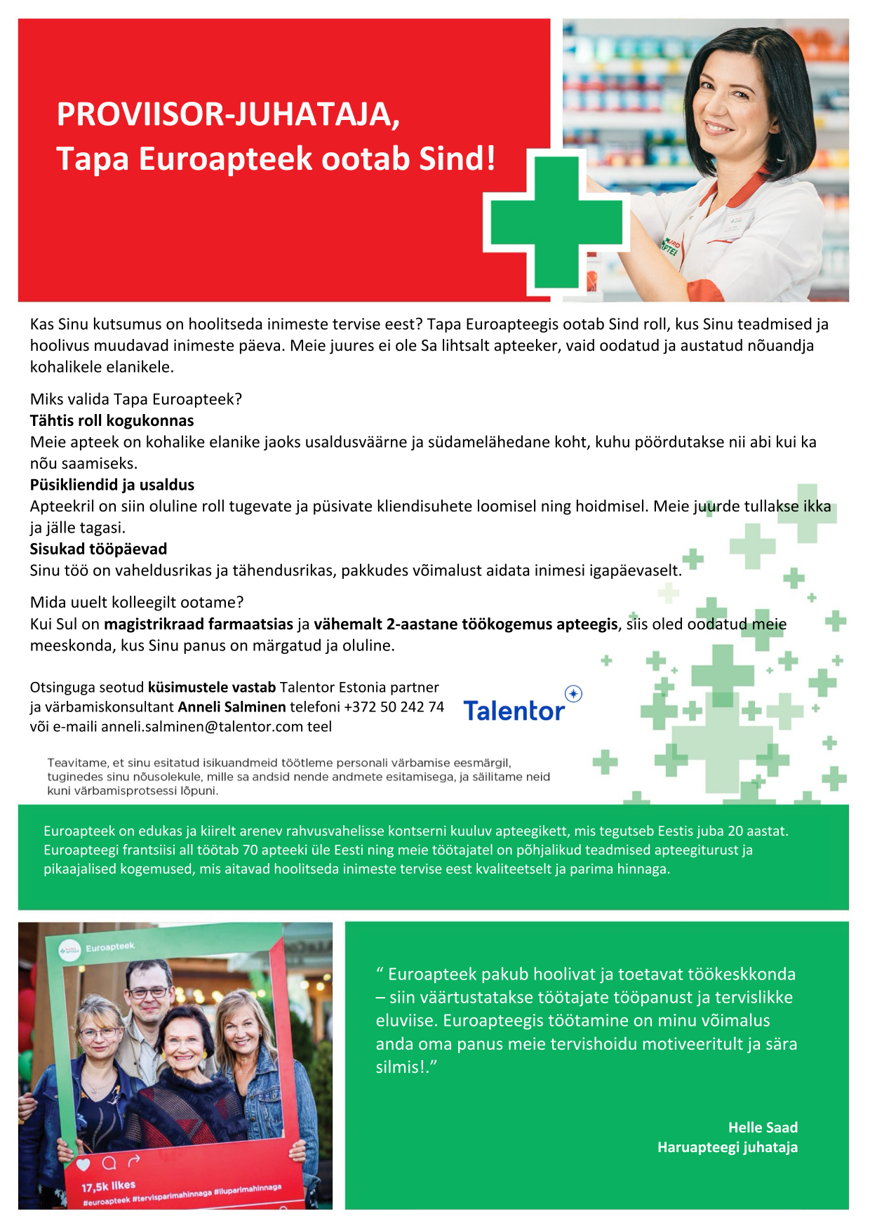 Euroapteek on edukas ja kiirelt arenev rahvusvahelisse kontserni kuuluv apteegikett, mis tegutseb Eestis juba 20 aastat.