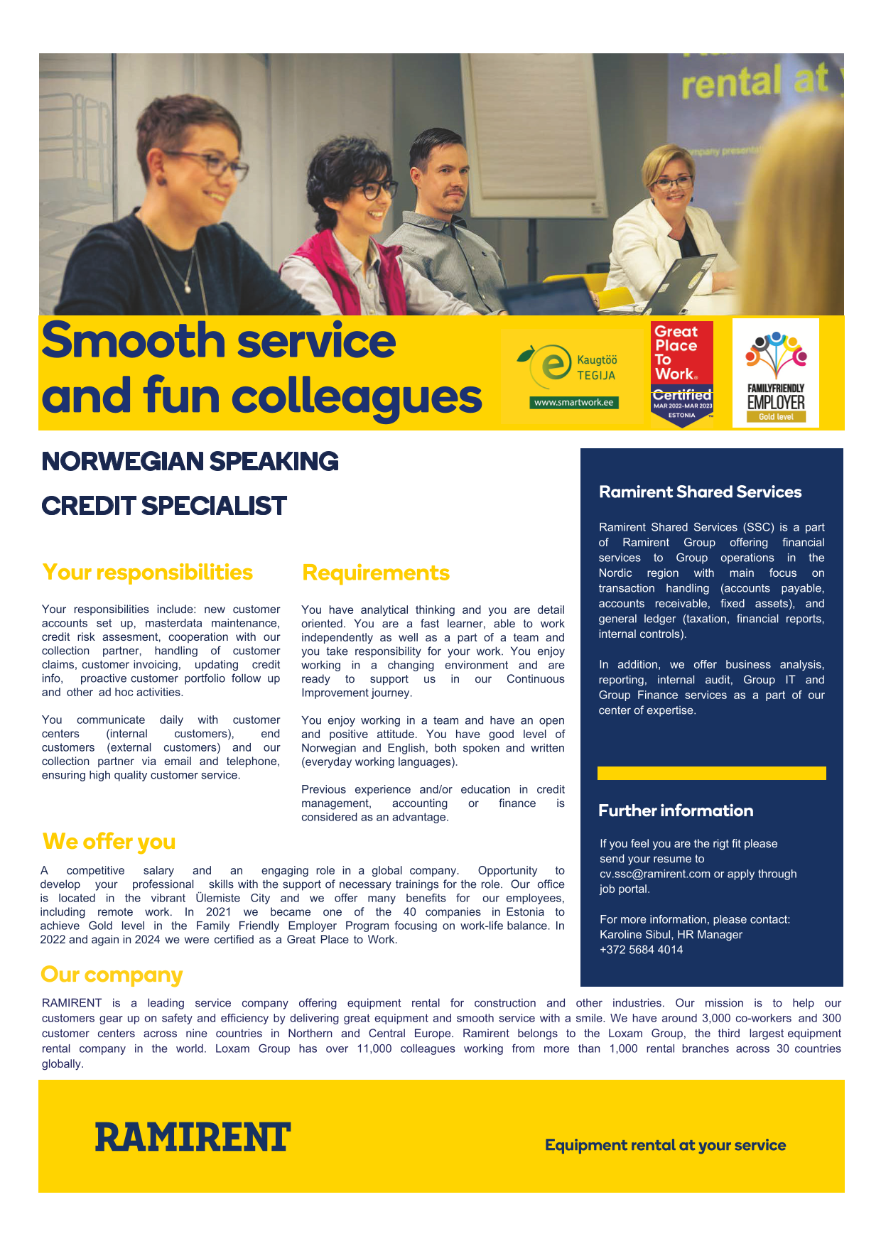 RAMIRENT is a leading service company offering equipment rental for construction and other industries. Our mission is to help our customers gear up on safety and efficiency by delivering great equipment and smooth service with a smile. We have around 3,000 co-workers and 300 customer centers across nine countries in Northern and Central Europe. Ramirent belongs to the Loxam Group, the third largest equipment rental company in the world. Loxam Group has over 11,000 colleagues working from more than 1,000 rental branches across 30 countries globally.