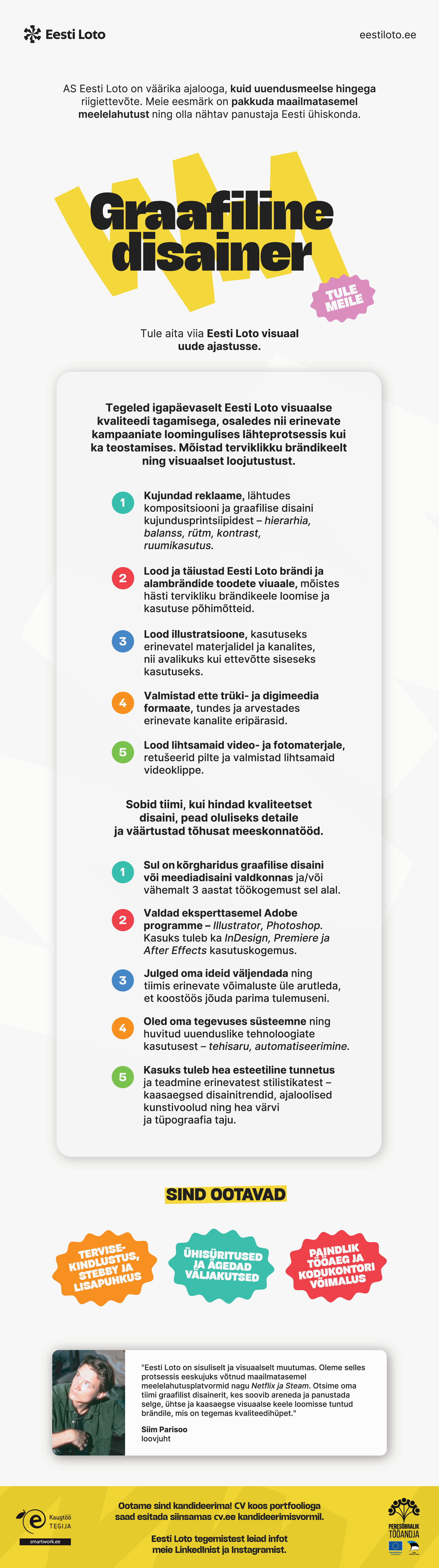 - Sind ootavad paindlikud töötingimused, professionaalne areng ja võimalus panustada avaliku usaldusega organisatsioonis.