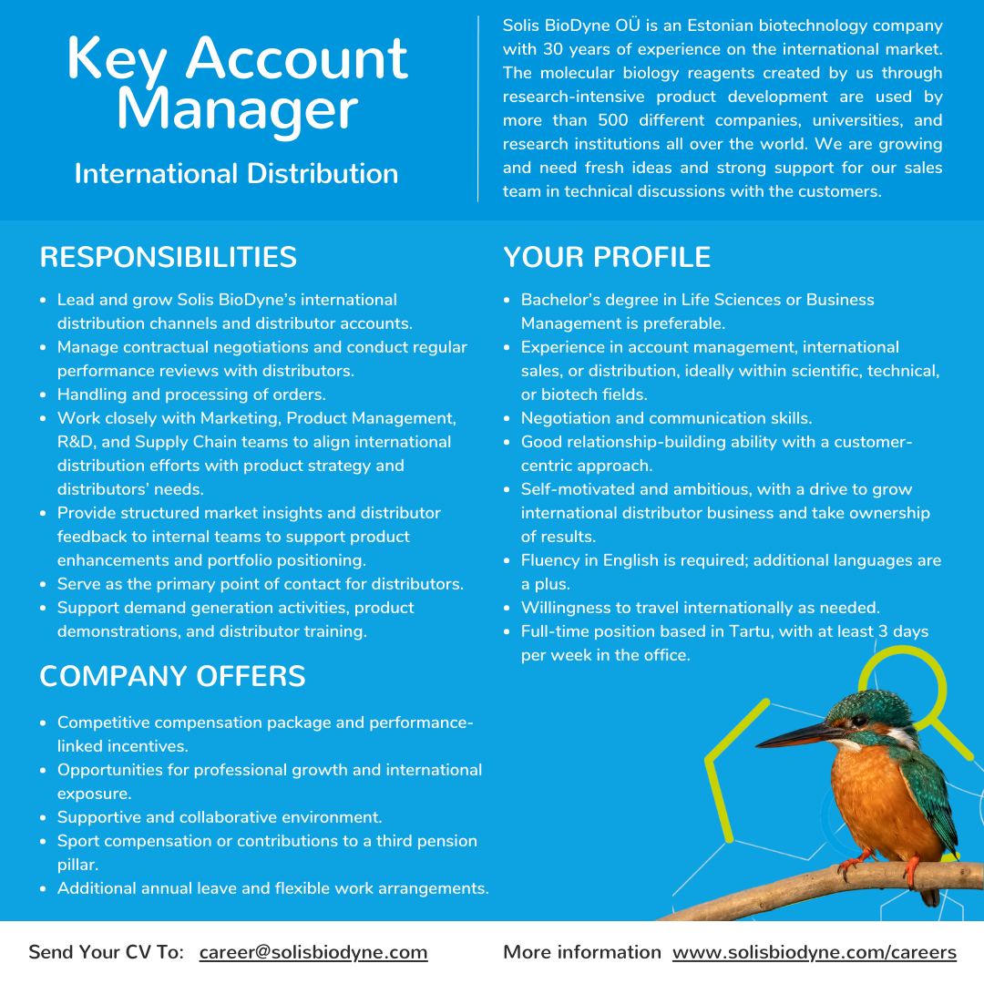 Solis BioDyne OÜ is an Estonian biotechnology company with 30 years of experience on the international market. The molecular biology reagents created by us through research-intensive product development are used by more than 500 different companies, universities, and research institutions all over the world. Solis BioDyne OÜ was awarded the Innovator of the Year prize in 2022 by Enterprise Estonia.