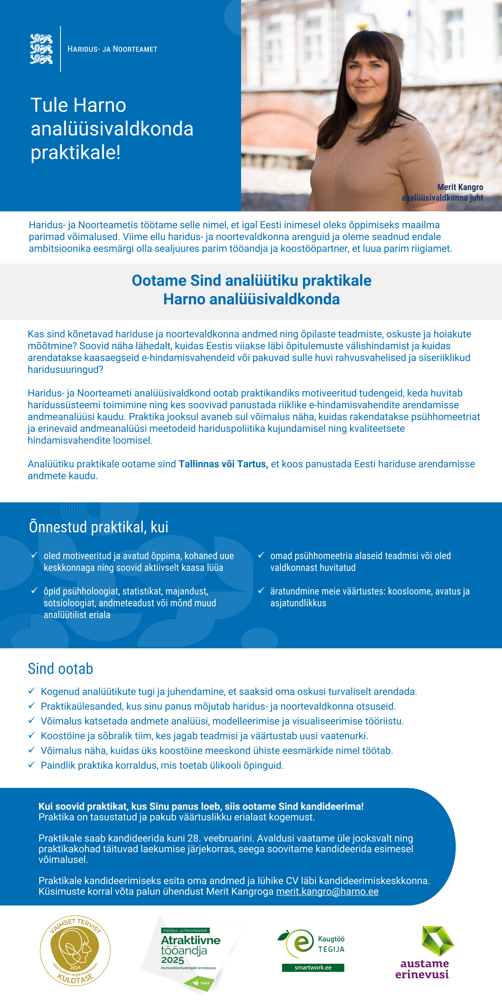 Harno töötab selle nimel, et luua tõhus, kaasav ja toetav haridussüsteem, mis vastab ühiskonna vajadustele ja rahvusvahelistele standarditele. Meie neljas osakonnas ja ühes agentuuris töötab umbes 370 spetsialisti selle nimel, et igal Eesti inimesel oleks õppimiseks maailma parimad võimalused.