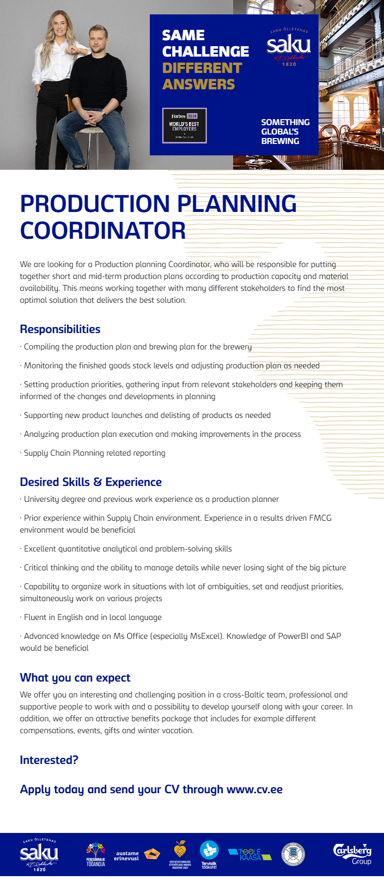 Saku Õlletehase AS-is, Carlsbergi grupi Baltikumi üksuses, ootab sind ees rahvusvahelise joogitööstuse põnev maailm. Siin töötavad oma ala tipptegijad, kes igapäevaselt pingutavad selle nimel, et meie tooted oleksid laitmatu kvaliteediga ja pakuksid unikaalseid maitseelamusi. Meie jaoks on oluline mõelda paremale tänasele ja homsele.