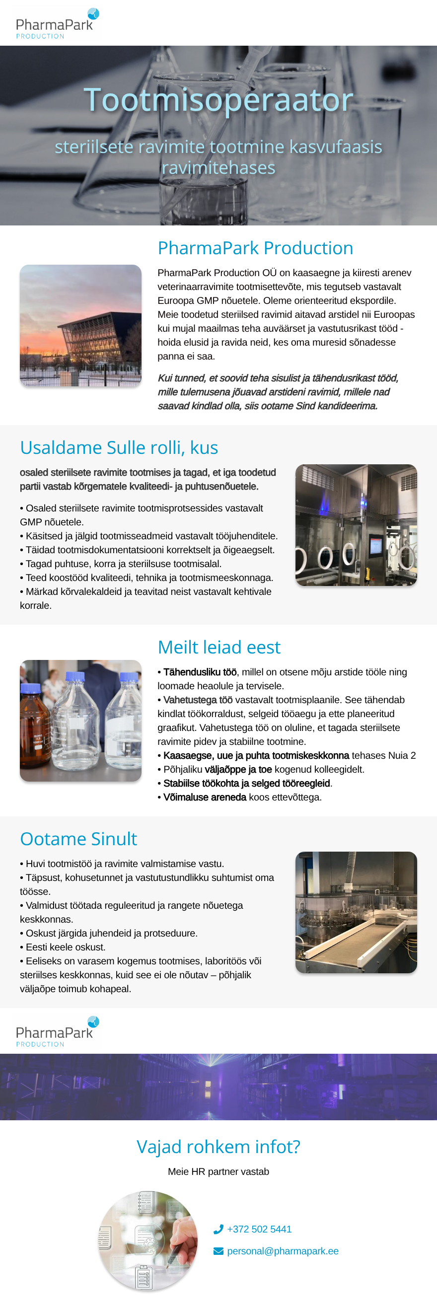 Pharmapark Production OÜ on kiiresti arenev ravimitehas, kus toodetakse steriilseid ja aseptilisi veterinaarravimeid. Meie uus tehas vastab kõigile Euroopa Liidu Annex 1 GMP nõuetele ja kasutab kaasaegseid tööstus 4.0 tehnoloogiaid. Keskendume süstelahuste, infusioonide, aseptiliste suspensioonide ja silmaravimite tootmisele. Ettevõte on orienteeritud ekspordile. Oma töötajate jaoks oleme loomas töökeskkonda, kus on kindel koht ka pere- ja töötajasõbralikel väärtustel.