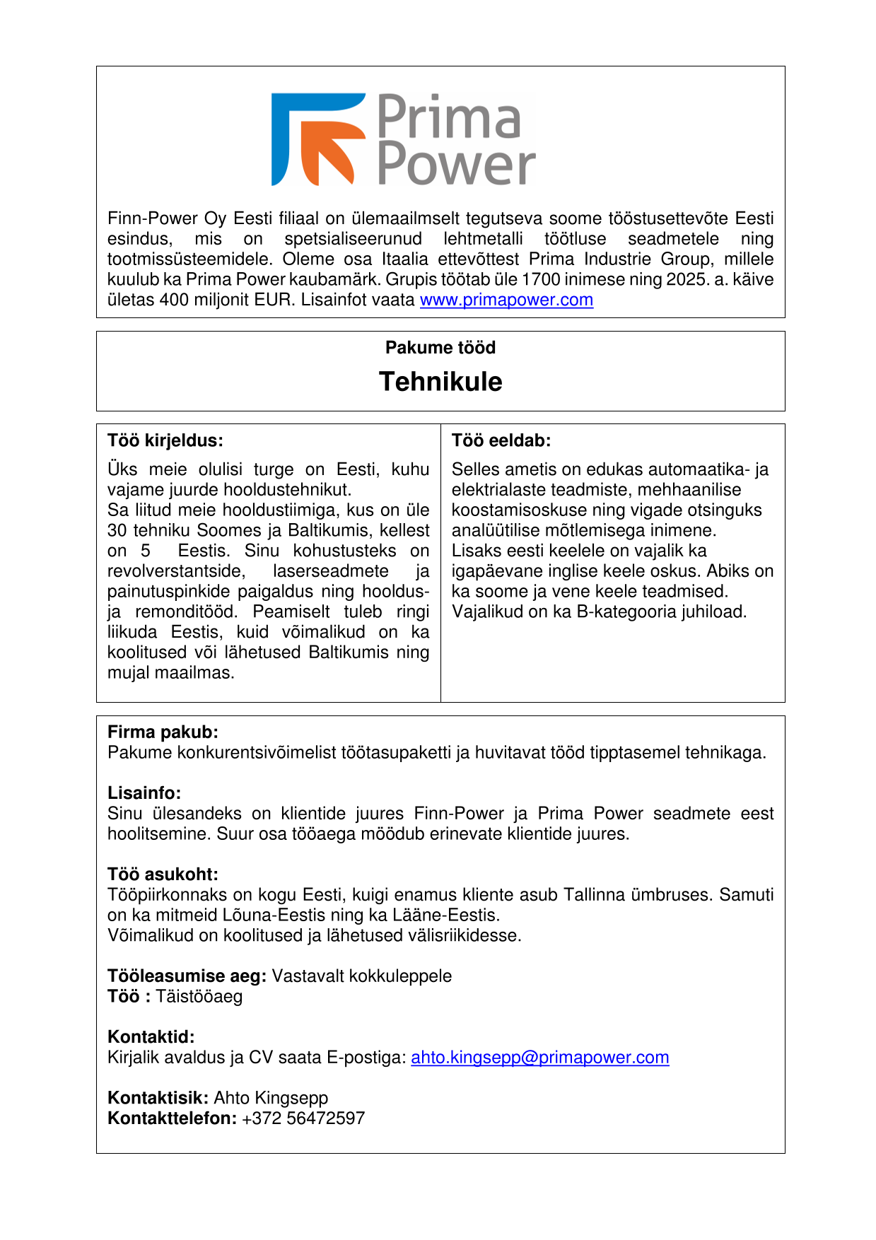 Finn-Power Oy Eesti filiaal on ülemaailmselt tegutseva soome tööstusettevõte Eesti esindus, mis on spetsialiseerunud lehtmetalli töötluse seadmetele ning tootmissüsteemidele. Oleme osa Itaalia ettevõttest Prima Industrie Group, millele kuulub ka Prima Power kaubamärk. Grupis töötab üle 1700 inimese ning 2024. a. käive ületas 400 miljonit EUR. Lisainfot vaata www.primapower.com