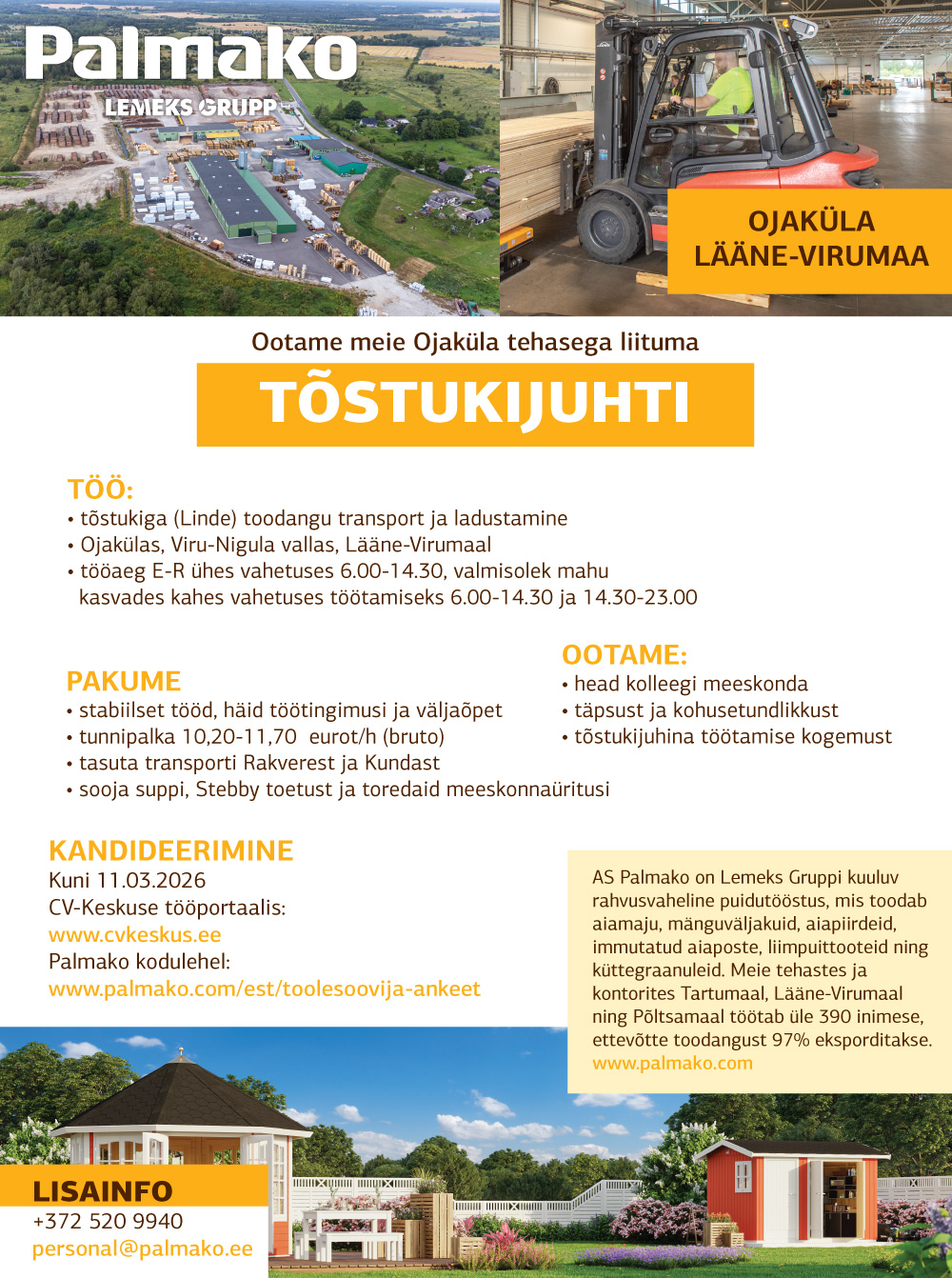 AS Palmako on Lemeks Gruppi kuuluv rahvusvaheline puidutööstus, mis toodab aiamaju, mänguväljakuid, aiapiirdeid, immutatud aiaposte, liimpuittooteid ning küttegraanuleid. Meie tehastes ja kontorites Tartumaal, Lääne-Virumaal ning Põltsamaal töötab üle 380 inimese, ettevõtte toodangust 97% eksporditakse.www.palmako.com