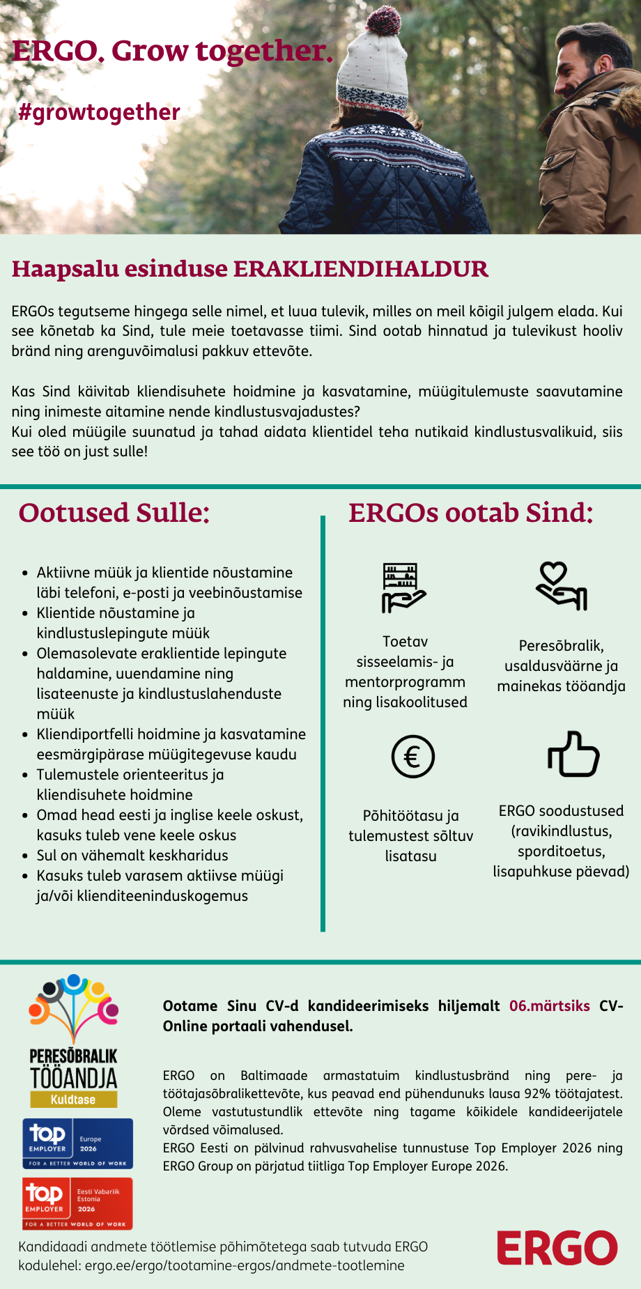 ERGO on kõige armastatum, inimlikum ja rohelisem kindlustusbränd Baltikumis, kus peavad end pühendunuks lausa 92% töötajatest. Meie kindlustusseltsi kogemusi ning pakutavaid vara-, elu ja ravikindlustusteenuseid usaldab Eestis üle 120 000 kliendi. Eesti ERGOkate toetavas meeskonnas annab selleks igapäevaselt oma panuse ligi 280 inimest. Meie töötajate sõnul on nad ERGO tööandjaks valinud just seetõttu, et meie tööl on suurem eesmärk luua julgem tulevik maandatud riskidega. Ning seda saab teha stabiilses ja arenguvõimalusi pakkuvas ettevõttes koos toetavate kolleegidega.