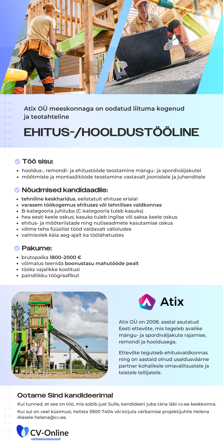Atix OÜ on 2008. aastal asutatud Eesti ettevõte, mis tegeleb avalike mängu ja spordiväljakute rajamise, remondi ja hooldusega. Ettevõte tegutseb ehitusvaldkonnas ning on aastaid olnud usaldusväärne partner kohalikele omavalitsustele ja teistele tellijatele.