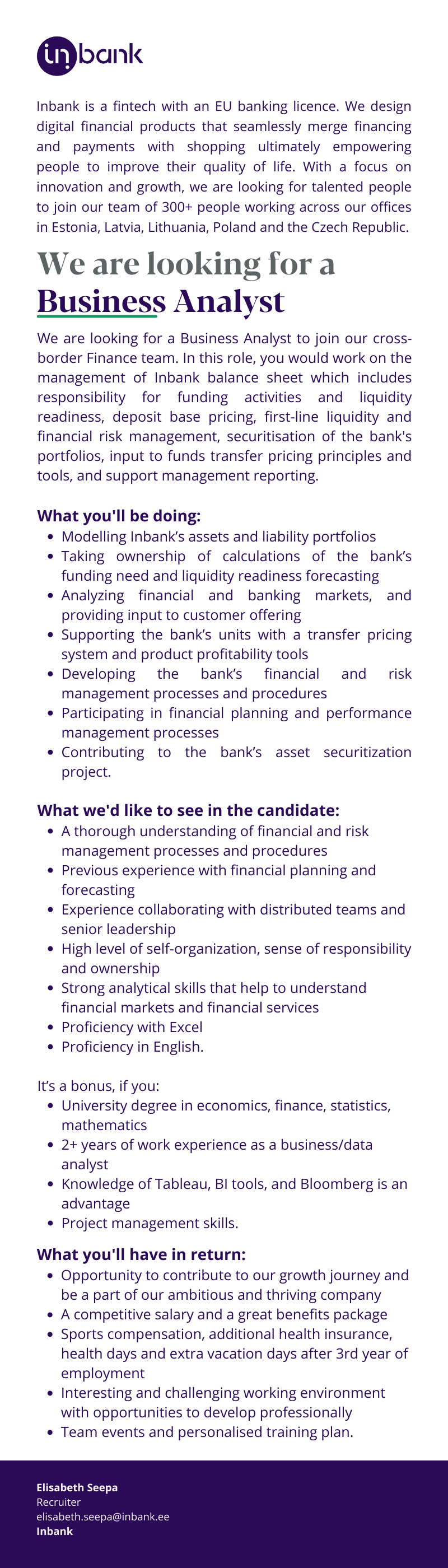 Banking is moving out of banks and becoming part of people's daily digital lives. Inbank's financing solutions are seamlessly embedded into the shopping journey of more than 5,000 merchants. This helps our partners grow their business, while customers can choose between individual payment methods exactly where they are. Focusing on innovation and rapid growth, we are looking for new talent for our international team.