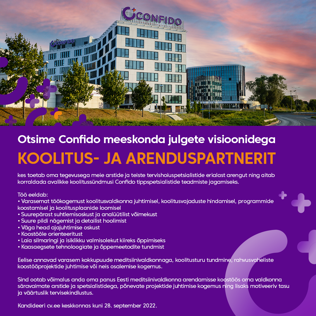 koolitus- ja arenduspartnerit, kes toetab oma tegevusega meie arstide ja teiste tervishoiuspetsialistide erialast arengut ning aitab korraldada avalikke koolitussündmusi Confido tippspetsialistide teadmiste jagamiseks.